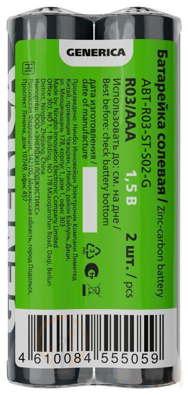 Батарейки солевые мизинчиковые GENERICA AAA / R03, 2 шт. в пленке. Солевые батарейки гораздо доступнее щелочных. Они предназначены для устройств с небольшим энергопотреблением: настенных часов, пультов дистанционного управления, радиоприёмников, счётчиков газа и воды и других подобных приборов. Соответствуют ГОСТ 12.2.007.12, ГОСТ 24721, ГОСТ Р МЭК 60086-1 (IEC 60086-1), ГОСТ 2583-92.