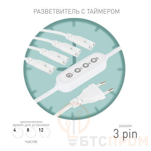 Разветвитель сетевой для линейных светильников ЭРА Разветвитель 4х IEC C7 3pin 2m+timer на 4 точки с таймером 4, 8, 12H — удобное устройство для одновременного подключения до трёх светильников к электрической сети. Таймер позволяет автоматически включать и выключать лампы в заданное время, создавая оптимальные условия освещения для растений. <strong>Основные характеристики:</strong> <ul style="list-style-type:disc"> <li>Тип разъёма: 2 pin IEC C5.</li> <li>Количество выходов: 3.</li> <li>Длина кабеля: 2 метра.</li> <li>Встроенный таймер.</li> </ul> Разветвитель обеспечивает стабильное питание для подключаемых светильников и упрощает организацию фитоосвещения. Функция таймера особенно полезна для автоматизации ухода за растениями, позволяя контролировать освещение даже в ваше отсутствие. Перед использованием рекомендуется ознакомиться с инструкцией по эксплуатации светильников и соблюдать правила безопасности при работе с электрическими устройствами. ЭРА FITO 3х IEC C5 — надёжное решение для удобного подключения и управления освещением в теплицах, на подоконниках или других местах, где требуется фитоосвещение.