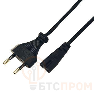 Шнур сетевой СЕЕ 7/16 - разъем IEC 320 C7, 2x0.5 мм2, 1.5 м предназначен для подключения к сети переменного тока (AC) с напряжением 220 B аудио- и видеоаппаратуры, источников питания ноутбуков, игровых консолей и других приборов, имеющих штыревой сетевой разъем типа С8 (известен из-за его формы как «восьмерка»). Данный сетевой шнур (IEC cord) оснащен с одной стороны литой неразборной плоской вилкой СЕЕ 7/16 , с другой — литым гнездовым неполяризованным разъемом типа IEC 320 C7 и двухжильным проводом с сечением проводника 0.5 мм2. Основные характеристики: Тип вилки: СЕЕ 7/16 Тип разъема: IEC 320 C7 Изоляция жил и общая оболочка изготовлена из ПВХ Длина провода: 1.5 м Максимальная сила тока: 3 А Шнур имеет многопроволочные жилы, заключенные в эластичную двойную изоляцию из ПВХ, что делает его максимально гибким и увеличивает срок эксплуатации изделия.
