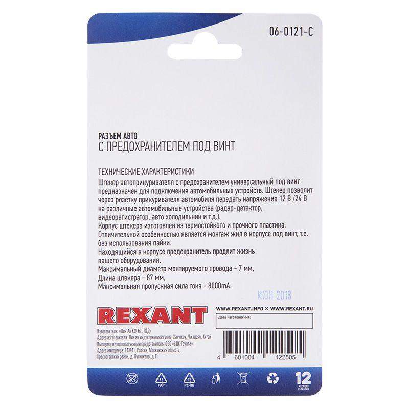 Штекер автоприкуривателя Rexant предназначен для подключения различных электронных устройств к бортовой сети автомобиля. Изделие позволяет через розетку прикуривателя автомобиля передать напряжение 12 B/24 В на различные автомобильные устройства: радар-детектор, видеорегистратор, автохолодильник и т .д. Корпус штекера изготовлен из термостойкого и прочного ABS-пластика. Для защиты оборудования от скачков напряжения предусмотрен предохранитель на 2 А. Отличительной особенностью штекера является монтаж жил в корпусе под винт, то есть без использования пайки.