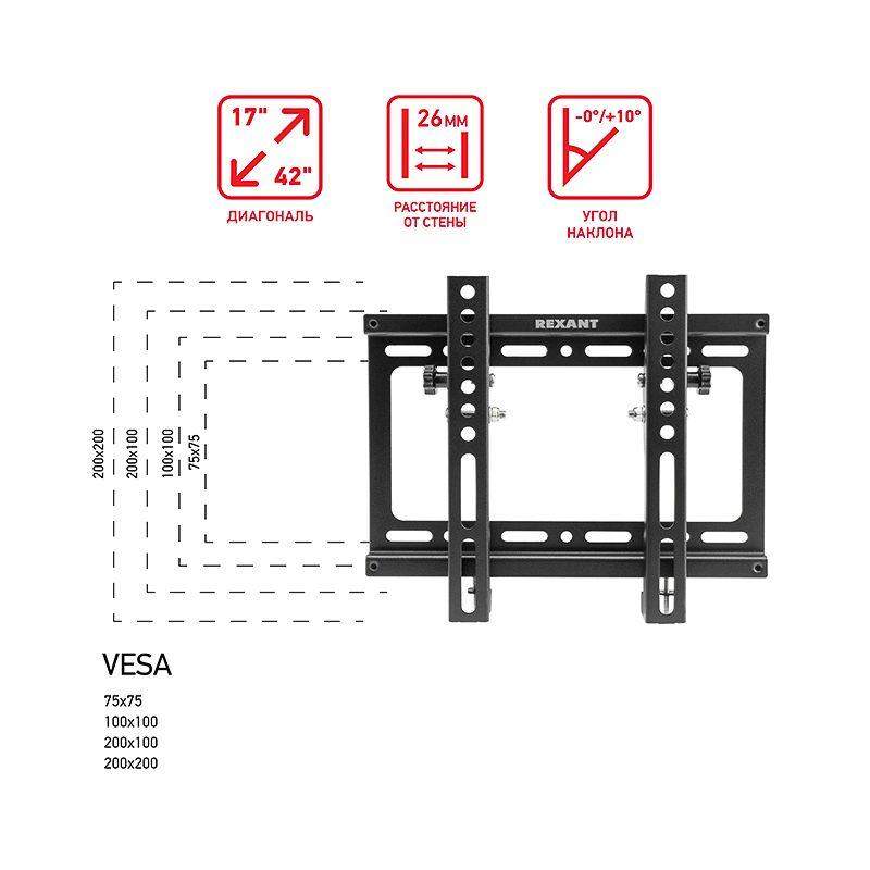 Настенный кронштейн – оптимальное приспособление для современного дома и офиса. Продуманная конструкция кронштейна предназначена для крепления на стену телевизор с диагональю 13"-43" дюймов. Благодаря возможности наклона кронштейна просмотр телевизора будет комфортным из любой точки помещения. Положение техники можно настроить таким образом, что изображение не будет «бликовать» при смене освещения. Механизм позволяет менять направление экрана без усилий и сохраняет заданное положение монитора с высокой точностью. Кронштейн незаметен на стене, поэтому прекрасно впишется в любой интерьер. В комплекте поставляются все необходимые универсальные крепления. Для удобства монтажа предусмотрен встроенный строительный уровень. Расстояние от стены до кронштейна: 23 мм Поддержка крепления стандарта VESA: 50x50/75x75/100x100/200x200 мм.