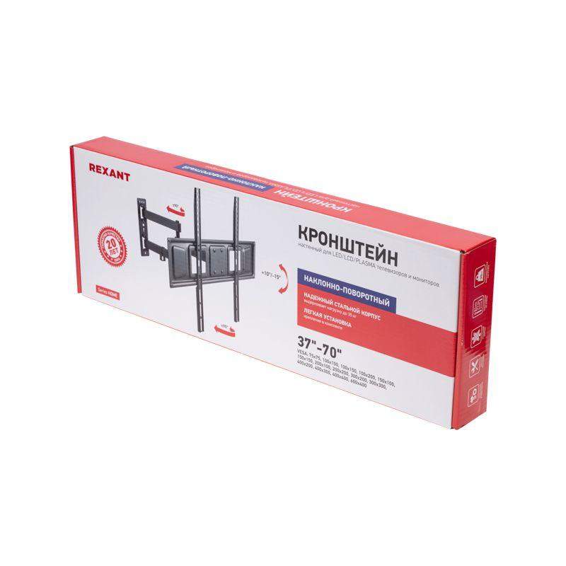 Кронштейн REXANT используется для крепления LED, LCD, PLASMA телевизоров и мониторов 37"- 70" дюймов к стене. Оснащен наклонно-поворотным механизмом (с 2 коленами), который позволяет свободно регулировать положение телевизора, что обеспечивает комфортный и удобный просмотр вне зависимости от Вашего расположения в комнате. В любой момент телевизор можно повернуть в нужную Вам сторону, выставить необходимый угол наклона и избежать бликов при смене освещения. Конструкция механизма позволяет точно и надежно фиксировать заданное положение с максимальной точностью. Кронштейн изготовлен из прочной и износоустойчивой стали, что гарантирует безопасность в процессе использования. Все необходимые крепления для установки изделия поставляются в комплекте, что обеспечивает удобный и быстрый монтаж. Расстояние от стены до кронштейна регулируется от 71 до 431 мм. Поддержка крепления стандарта VESA: 75x75, 100x100, 100x150, 100x200, 150x100, 150x150, 200x100, 200x200, 300x200, 300x300, 400x200, 400x300, 400x400, 600x400.
