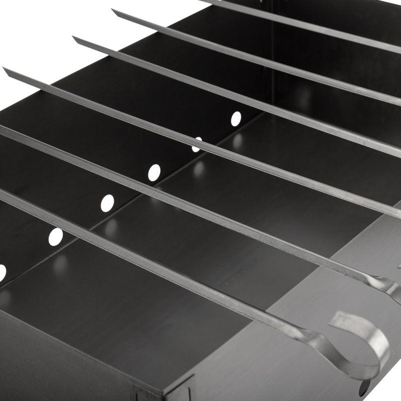 Походный компактный разборный мангал СОКОЛ изготовлен из стали, не подвергается тепловым деформациям от углей и дров. Предназначен для многоразового использования. Сборка и установка мангала производится вручную без использования специальных инструментов. На стенках жаровни предусмотрены специальные отверстия для интенсивного горения. Общая высота ножек 350 мм оптимальна и удобна для приготовления шашлыков. Размеры жаровни 350х250 мм позволяют разместить шампуры и получить порцию блюда, рассчитанную на небольшую компанию. Толщина стенки – 0,4 мм. В разобранном виде мангал не занимает много места и легко помещается в багажник автомобиля. В комплекте предусмотрены 6 угловых шампуров размером 370х10х0,6 мм. Изделие поставляется в гофрированной коробке из плотного картона. Размеры мангала (ДхШхВ): 350х250х350 мм.