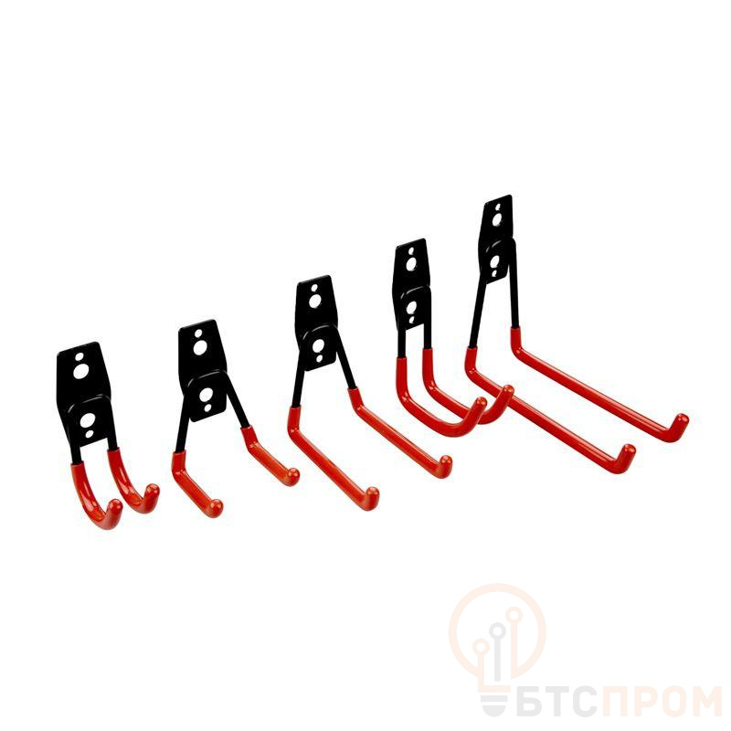 Набор состоит из пяти крюков, которые используются для фиксации предметов или конструкций на стенах. Изделия выполнены из стали и имеют ПВХ покрытие, которое защищает закрепленные предметы от царапин и повреждений, а также предотвращает их скольжение или смещение. Для обеспечения быстрого и удобного монтажа в комплекте поставляются крепления. Комплектация набора: Маленький J-образный крюк, 65 мм; Большой J-образный крюк, 105 мм; Маленький L-образный крюк, 65 мм; Средний L-образный крюк, 125 мм; Большой L-образный крюк, 180 мм.