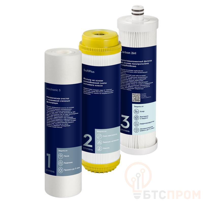 Комплект сменных картриджей к системам фильтрации воды Electrolux серии AquaModule. Подходит для комплексной очистки воды с высоким содержанием солей жесткости, хлора, органических соединений и механических примесей. Мультикомпонентная ступень очистки на основе технологии Carbon2in1 превращает трехступенчатую систему фильтрации в четырехступенчатую. Ступень обеспечивает комплексную механическую очистку от песка, ила, ржавчины и прочих примесей, а так же обеспечивает сорбционную очистку от хлора и хлорорганических соединений. Универсальность ступени позволяет ее исползовать в качестве как предварительной ступени так и в качестве финишной ступени очистки. Механический фильтр с градиентной структурой. Срок службы увеличен на 30% по сравнению с аналогичными ступенями очистки. За счет градиентной структуры степень фильтрации меняется с 10 до 5мкм по мере прохождения воды через фильтр, что позволяет задействовать всю площадь фильтрующего элемента и распределить загрязнения более равномерно не забивая верхние слои. Ионообменная смола для очистки воды от солей жесткости. Без привкуса и запаха. Исключает образование накипи на нагревательных приборах.