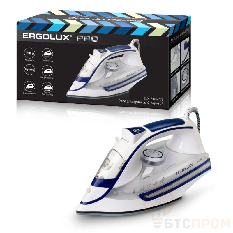 Мощность 2600Вт, керамическая подошва 216х115 мм. Сухое глажение, разбрызгивание, регулировка подачи пара, вертикальное отпаривание, мощный паровой удар, функция самоочистки, длинный шнур 2 м.