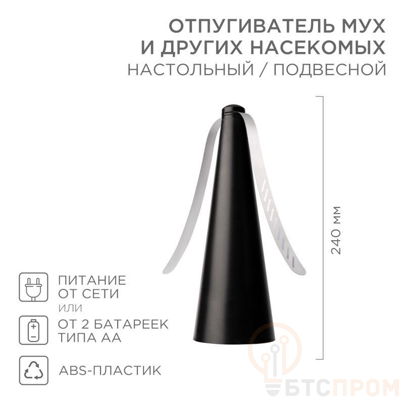 Отпугиватель REXANT поможет отогнать насекомых от вашего стола и пищи. Достаточно установить прибор на горизонтальной поверхности и включить его. Когда лопасти начнут крутиться, это механическое действие отпугнет мух, ос и других назойливых насекомых. Благодаря отпугивателю, прием пищи в беседке, на свежем воздухе, дома или на природе во время пикника станет приятнее и комфортнее. Автономный прибор бесшумно работает на двух пальчиковых батарейках типа АА (не входят в комплект). Может подключаться к адаптеру постоянного питания мощностью 5 В (не в комплекте). Экологически чистый отпугиватель размером 8,2x8,2x24 см работает без добавления химикатов, не имеет запаха. Является абсолютно безопасным для людей и животных. Может работать в присутствии детей. Выполнен из гипоаллергенного ABS-пластика.
