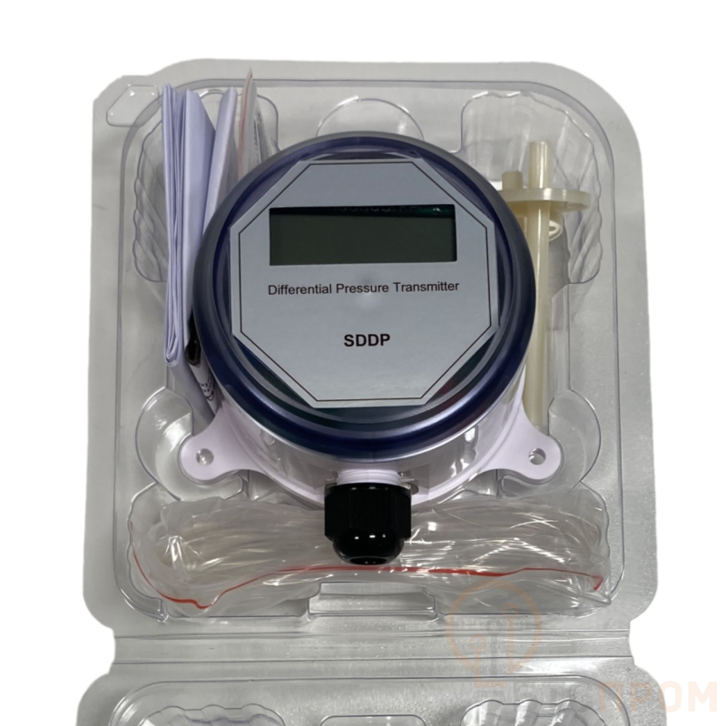 Датчик дифференциального давления канальный, для установки на воздуховод, два соединительных штуцера и трубка в комплекте поставки, выбираемый диапазон измерения ±500/±1000/±1500/±2000 Па, жидкокристаллический экран с отображением измеряемого значения, выходной сигнал 0…10 В, напряжение питания 12…30 В постоянного тока