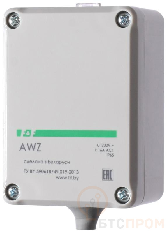 Фотореле (автомат светочувствительный) AWZ предназначен для автоматического включения освещения в сумерки и выключения на рассвете. Особенности - Герметичный (IP65). - Встроенный фотодатчик. Область применения Для управления освещением улиц, витрин магазинов, рекламы, автостоянок, железнодорожных переездов, остановочных пунктов, строек, коттеджей и т.п. Принцип работы основан на контроле уровня освещенности встроенным фотодатчиком. Автомат оснащен схемой помехозащиты от ложных срабатываний. Максимальный ток нагрузки - 16 А.