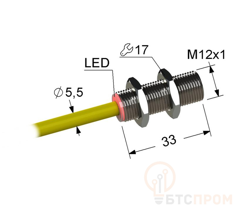 Выключатель функционирует по индуктивному принципу, обеспечивая бесконтактное обнаружение металлических объектов на расстоянии до 10 мм. Ключевые характеристики: напряжение питания 10-30 В постоянного тока, нормально-замкнутый выход (PNP), 3-проводное подключение и компактный цилиндрический корпус диаметром 12 мм.
