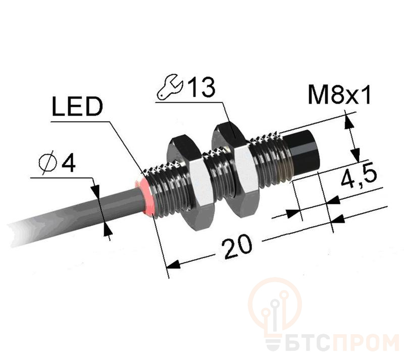 Ключевые характеристики: тип PNP (NO), напряжение питания 10-30 В постоянного тока, ток нагрузки до 200 мА, степень защиты IP67, что гарантирует устойчивость к пыли и влаге. Корпус выполнен из латуни с никелевым покрытием, резьба M20x1.5 для удобного монтажа. Компактный цилиндрический форм-фактор и встроенный светодиодный индикатор состояния облегчают установку и диагностику.
