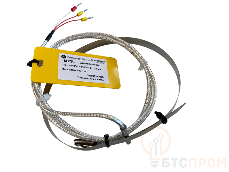 Датчик температуры контактный, диапазон -10…+110°С, выходной сигнал PT1000, 3-проводная схема, диаметр трубы O15…100мм, бескорпусное исполнение, кабель 1 м