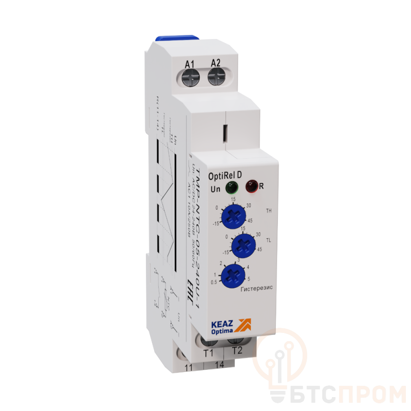 Реле контроля температуры предназначено для контроля заданной температуры по комплектному датчику NTC для предотвращения выхода из строя подключенного оборудования. Настройка температурных порогов производится с помощью поворотных регуляторов расположенных на лицевой поверхности реле.