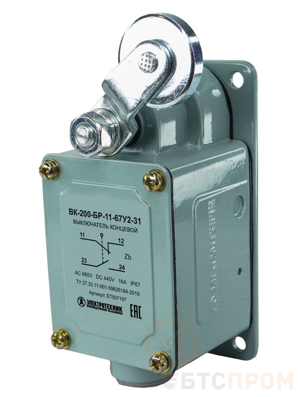 Выключатель конечный ВК-200-БР-11-67У2-31 от производителя "Электротехник" — это надежный аппарат управления, предназначенный для коммутации электрических цепей контроля и управления в зависимости от положения механизмов. Модель оснащена рычагом с роликом, обеспечивающим четкое срабатывание при контакте с управляемым объектом.