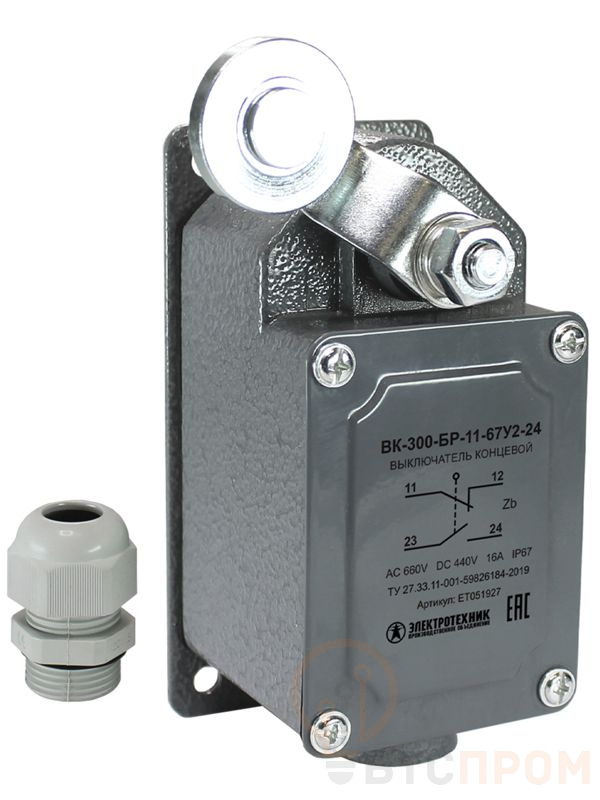 Выключатель конечный ВК-300 БР11-67У2-24 от производителя "Электротехник" (артикул ET051927) — это надежный и долговечный аппарат управления, предназначенный для коммутации цепей контроля и сигнализации в системах автоматики. Устройство срабатывает при достижении подвижными частями механизмов заданного положения.