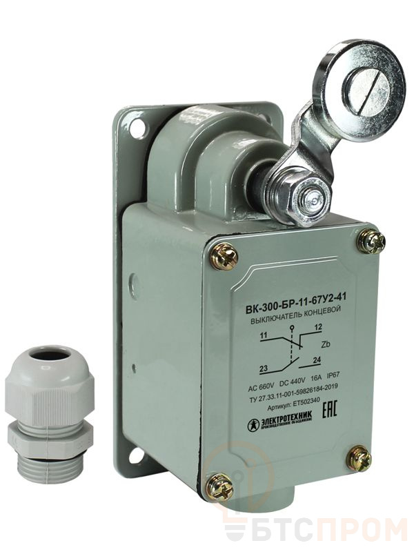 Выключатель конечный ВК-300 БР11-67У2-41 от производителя "Электротехник" (артикул ET502340) — это надежный аппарат управления, предназначенный для коммутации цепей контроля и сигнализации в зависимости от положения механизмов различных промышленных установок.