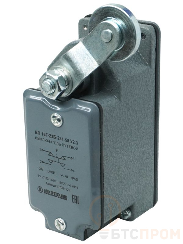 Выключатель конечный ВП 16Г-23Б-231-55 У2.3 от производителя "Электротехник" — это надежный и долговечный аппарат управления, предназначенный для коммутации электрических цепей контроля и сигнализации. Устройство срабатывает при достижении подвижными частями механизмов определенных положений, выполняя функции пуска, остановки или изменения режима работы оборудования.