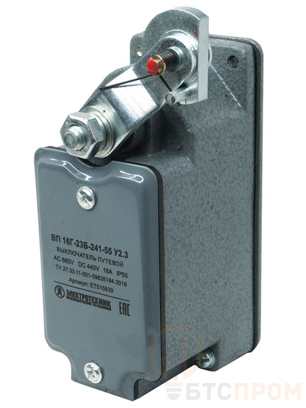 Выключатель конечный ВП 16Г-23Б-241-55 У2.3 от бренда Электротехник — это надежный и долговечный аппарат, предназначенный для коммутации электрических цепей управления и сигнализации. Устройство функционирует путем срабатывания при перемещении подвижного элемента механизма (толкателя или рычага) в заданное положение.