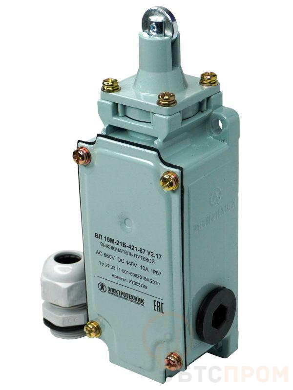 Выключатели путевые серии ВП 19 предназначены для применения в электрических цепях управления, сигнализации и контроля относительного положения подвижных частей механизма в пространстве. Основное применение - коммутации электрических цепей управления переменного тока напряжением до 660 В частотой 50/60 Гц и постоянного тока напряжением до 440 В под воздействием управляющих упоров в определенных точках пути контролируемого объекта. Благодаря многочисленным модификациям и 4-х полюсной системе контактов, выключатели используются в широком спектре. * Высокая степень защиты от воздействия влаги и пыли; * Высокая коммутационная износостойкость; * Ударопрочный силуминовый корпус; * Демпферный механизм привода обеспечивает надёжную работу привода; * Регулируемый шток привода позволяет легко и точно настроить моменты срабатывания выключателя.