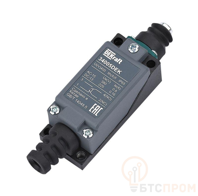 Концевой выключатель с группой контатков 1НО1НЗ, с механизмом типа кнопочный плунжер; имеет термопластичный корпус с двойной изоляцией, модульную конструкцию, облегчающую техническое обслуживание, а также компактную форму (в соответствии с DIN EN 50047-2020). Степени защиты IP65 и IK04 обеспечивают ударопрочность, что делает его идеальным для интенсивного использования в тяжелых условиях эксплуатации. Выключатель крепится на оборудование при помощи монтажных винтов с метрической или самонарезной резьбой и имеет электрическую изностойкость не менее 1 миллионов циклов в категории DC-13, он соответствует стандартам ГОСТ IEC 60947.-5-1, ГОСТ IEC 60204-1