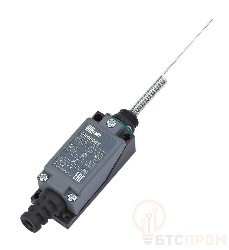 Концевой выключатель с группой контатков 1НО1НЗ, типа "Кошачий ус"; имеет термопластичный корпус с двойной изоляцией, модульную конструкцию, облегчающую техническое обслуживание, а также компактную форму (в соответствии с DIN EN 50047-2020). Степени защиты IP65 и IK04 обеспечивают ударопрочность, что делает его идеальным для интенсивного использования в тяжелых условиях эксплуатации. Выключатель крепится на оборудование при помощи монтажных винтов с метрической или самонарезной резьбой и имеет электрическую изностойкость не менее 1 миллионов циклов в категории DC-13, он соответствует стандартам ГОСТ IEC 60947.-5-1, ГОСТ IEC 60204-1