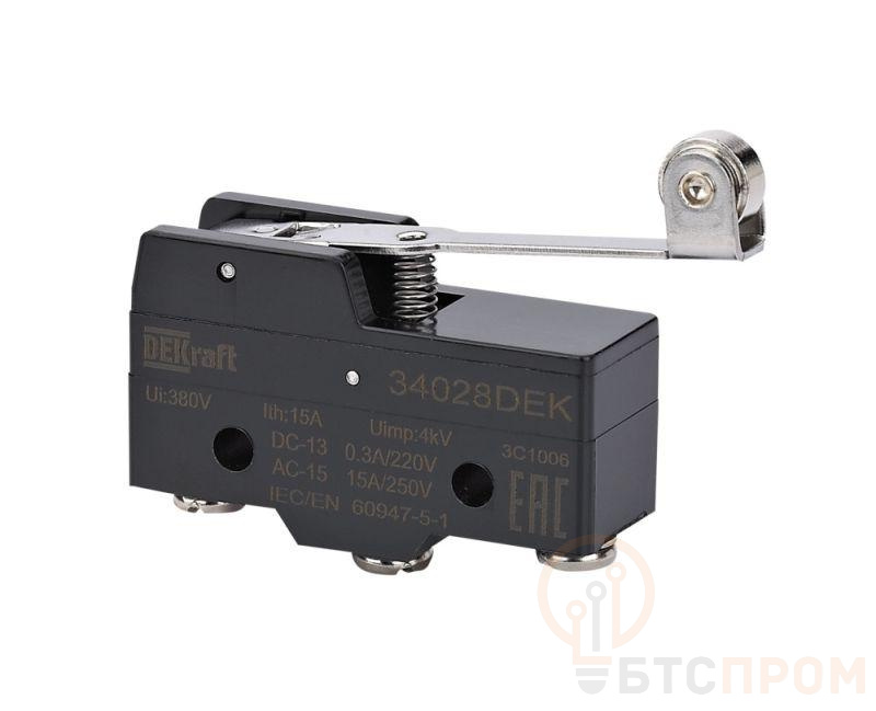 Выключатель концевой 1НО1НЗ миниатюрный шарнирн. длиннорычажного типа с метал. роликом DEKraft 34028DEK