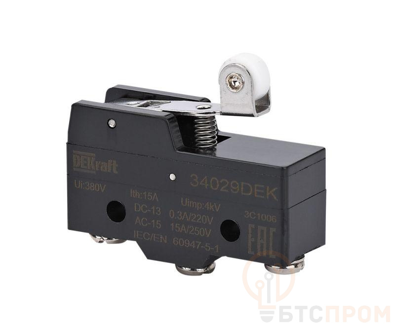 Выключатель концевой 1НО1НЗ миниатюрный шарнирн. короткого рычажного типа с роликом DEKraft 34029DEK