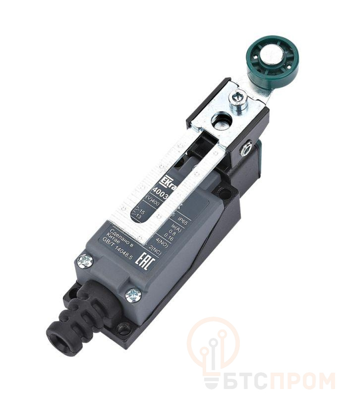 Концевой выключатель с группой контатков 1НО1НЗ, с роликовмй рычагом и регулиремой длины,из термопласта; имеет термопластичный корпус с двойной изоляцией, модульную конструкцию, облегчающую техническое обслуживание, а также компактную форму (в соответствии с DIN EN 50047-2020). Степени защиты IP65 и IK04 обеспечивают ударопрочность, что делает его идеальным для интенсивного использования в тяжелых условиях эксплуатации. Выключатель крепится на оборудование при помощи монтажных винтов с метрической или самонарезной резьбой и имеет электрическую изностойкость не менее 1 миллионов циклов в категории DC-13, он соответствует стандартам ГОСТ IEC 60947.-5-1, ГОСТ IEC 60204-1