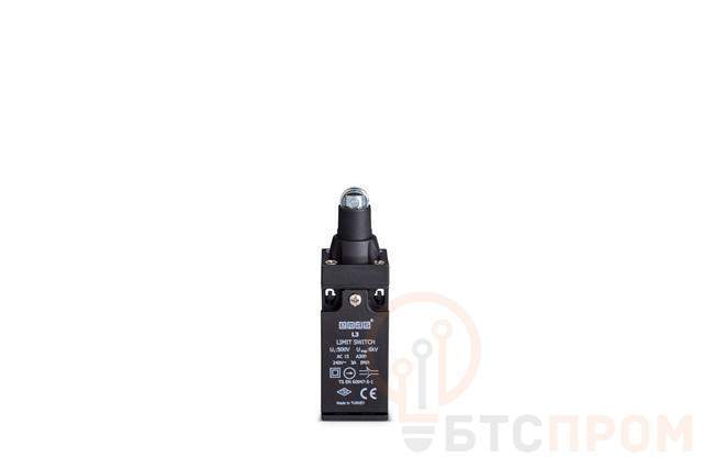 Выключатель концевой быстрого переключения линейный 3-х направленный с пластмас. консолью и стальным плунжером и роликок Ф13мм (1НО+1НЗ) EMAS L3K13MUM331