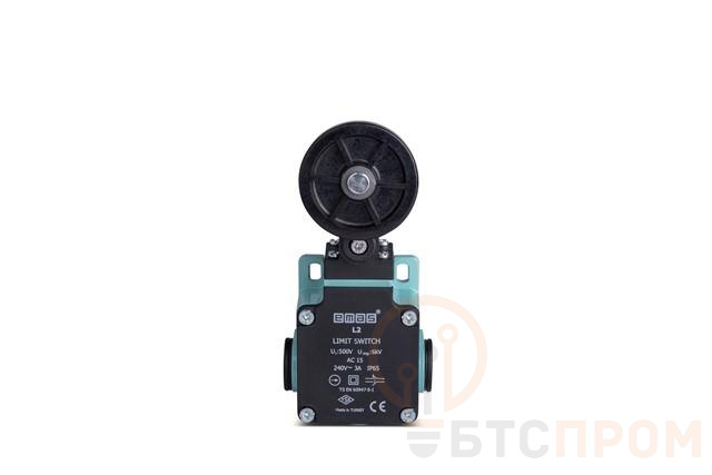Выключатель концевой быстрого переключения угловой 2-х направленный с пластмас. консолью и резиновым роликом Ф50мм (1НО+1НЗ) EMAS L2K13MEL121