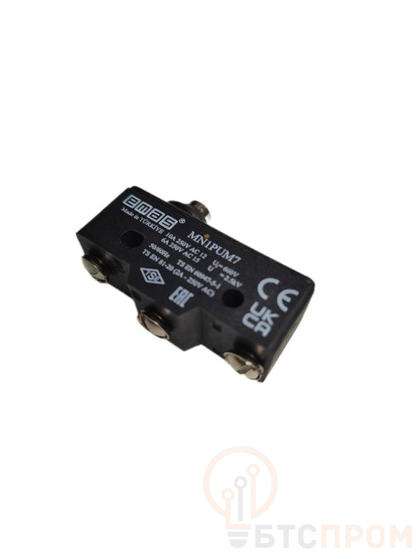Мини-выключатель с коротким подпружиненным плунжером. Механическая стойкость : не менее 500 000 операций. Электрическая стойкость : не менее 100 000 операций. Рабочая температура : T125 Максимальная частота включений : 60 механических операций в минуту, 30 электрических операций в минуту. Номинальное напряжение, Ue : 440 В перем. тока Номинальный ток, Ie : 10 А. Сопротивление изоляции : не менее 10 МОм (500 В пост. тока). Сопротивление контактов : не более 15 МОм. Диэлектрическое сопротивление : 1500 В перем. тока (1 минута). Влажность : не более 80%. Стандарты : TS 1472 EN 61058-1