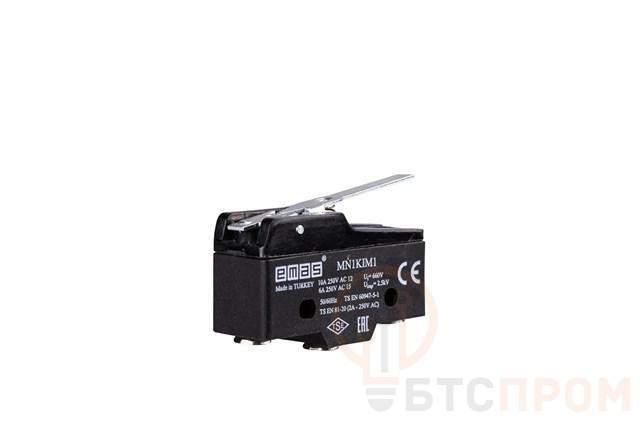Мини-выключатель с коротким рычажком. Механическая стойкость : не менее 500 000 операций Электрическая стойкость : не менее 100 000 операций. Рабочая температура : T125 Максимальная частота включений : 60 механических операций в минуту, 30 электрических операций в минуту. Номинальное напряжение, Ue : 440 В перем. тока Номинальный ток, Ie : 10 А. Сопротивление изоляции : не менее 10 МОм (500 В пост. тока). Сопротивление контактов : не более 15 МОм. Диэлектрическое сопротивление : 1500 В перем. тока (1 минута). Влажность : не более 80% Стандарты : TS 1472 EN 61058-1