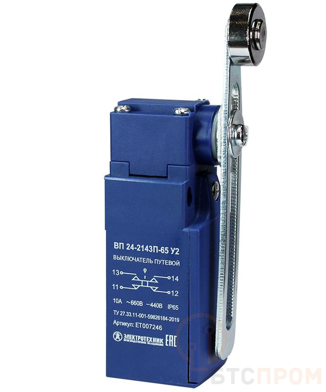 Выключатель путевой ВП 24-2143П-65 У2 1НО+1НЗ 3А IP65 рычаг со стальным роликом регулир. по длине безинерционный 20мм без сальника Электротехник ET007246
