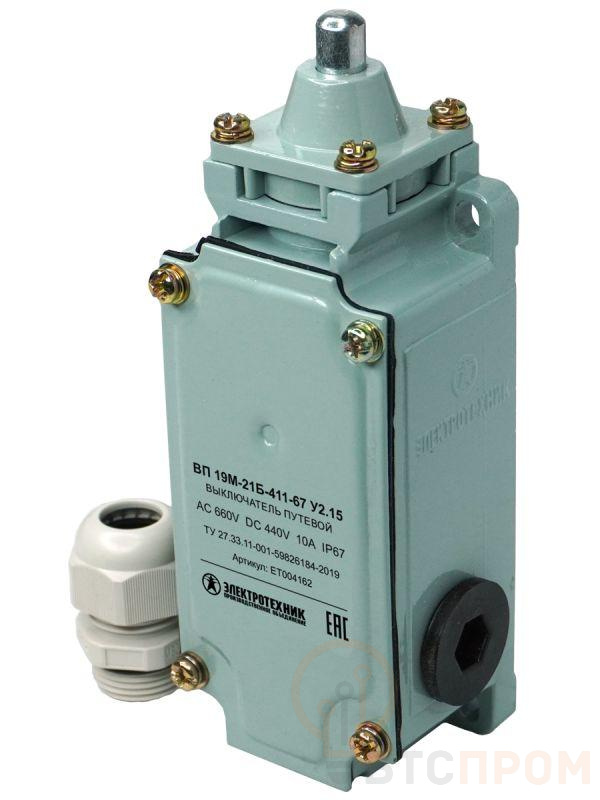 Выключатели путевые серии ВП 19 предназначены для применения в электрических цепях управления, сигнализации и контроля относительного положения подвижных частей механизма в пространстве. Основное применение - коммутации электрических цепей управления переменного тока напряжением до 660 В частотой 50/60 Гц и постоянного тока напряжением до 440 В под воздействием управляющих упоров в определенных точках пути контролируемого объекта. Благодаря многочисленным модификациям и 4-х полюсной системе контактов, выключатели используются в широком спектре. * Высокая степень защиты от воздействия влаги и пыли; * Высокая коммутационная износостойкость; * Ударопрочный силуминовый корпус; * Демпферный механизм привода обеспечивает надёжную работу привода; * Регулируемый шток привода позволяет легко и точно настроить моменты срабатывания выключателя.