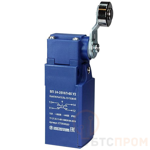 Выключатель путевой ВП 24-2516П-65 У2 1НО+1НЗ 3А IP65 рычаг со стальным роликом инерционный 20мм без сальника Электротехник ET004680