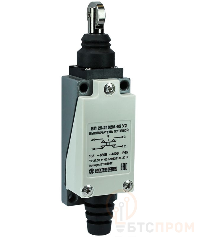 Выключатель путевой ВП 25-2102М-65 У2 1НО+1НЗ 3А IP65 толкатель с роликом безинерционный 21х56мм Электротехник ET003887