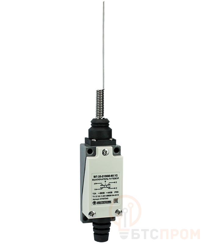 Выключатель путевой ВП 25-2106М-65 У2 1НО+1НЗ 3А IP65 рычаг пружинный "кошачий ус" безинерционный 21х56мм Электротехник ET007240