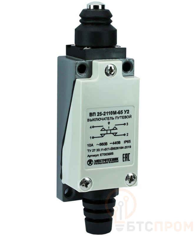 Выключатель путевой ВП 25-2110М-65 У2 1НО+1НЗ 3А IP65 толкатель безинерционный 21х56мм Электротехник ET003889