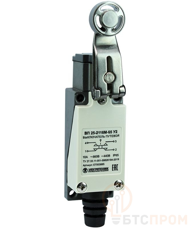 Выключатель путевой ВП 25-2116М-65 У2 1НО+1НЗ 3А IP65 рычаг со стальным роликом безинерционный 21х56мм Электротехник ET003885