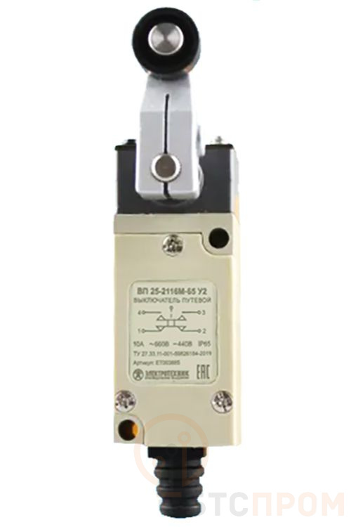 Выключатель путевой ВП 25-2118М-65 У2 1НО+1НЗ 3А IP65 рычаг с пластик. роликом безинерционный 21х56мм Электротехник ET003891