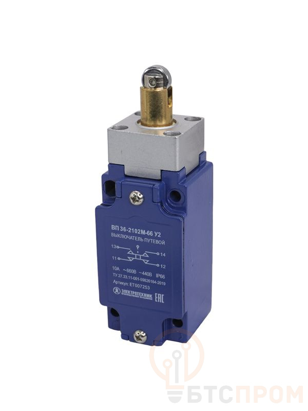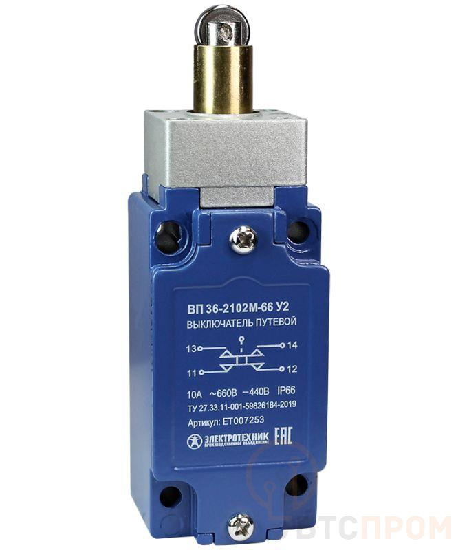 Выключатель путевой ВП 36-2102М-66 У2 1НО+1НЗ 3А IP66 толкатель с роликом безинерционный 30х60мм без сальника Электротехник ET007253