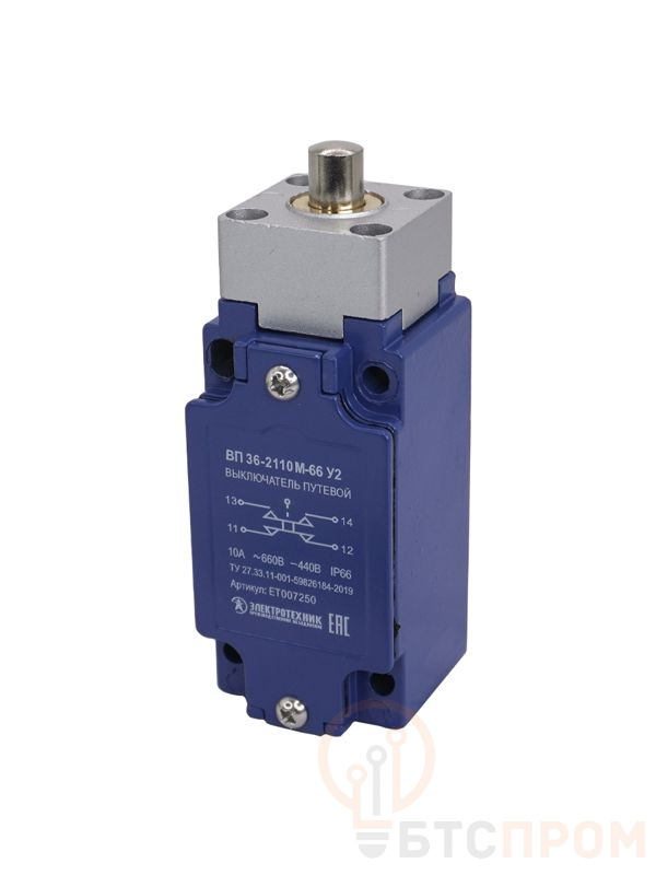 Выключатель путевой ВП 36-2110М-66 У2 1НО+1НЗ 3А IP66 толкатель безинерционный 30х60мм без сальника Электротехник ET007250