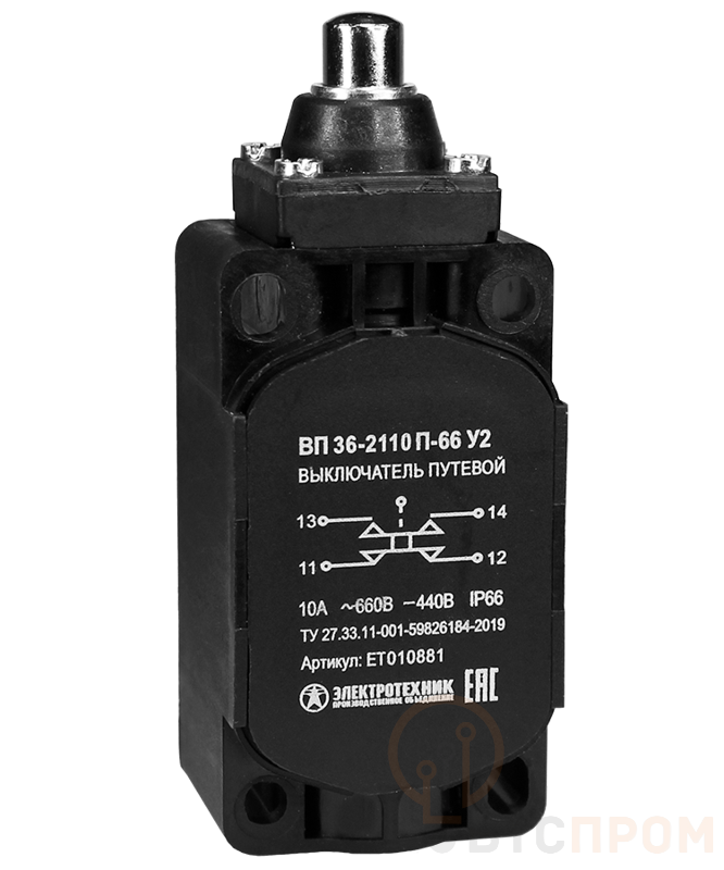 Выключатель путевой ВП 36-2110П-66 У2 1НО+1НЗ 3А IP66 толкатель безинерционный 30х60мм без сальника Электротехник ET010881