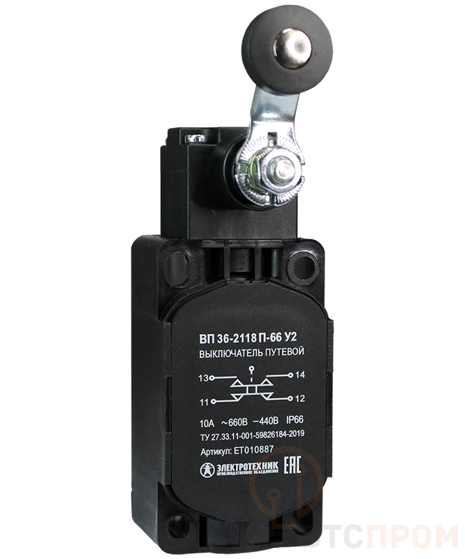 Выключатель путевой ВП 36-2118П-66 У2 1НО+1НЗ 3А IP66 рычаг с пластик. роликом безинерционный 30х60мм без сальника Электротехник ET010887