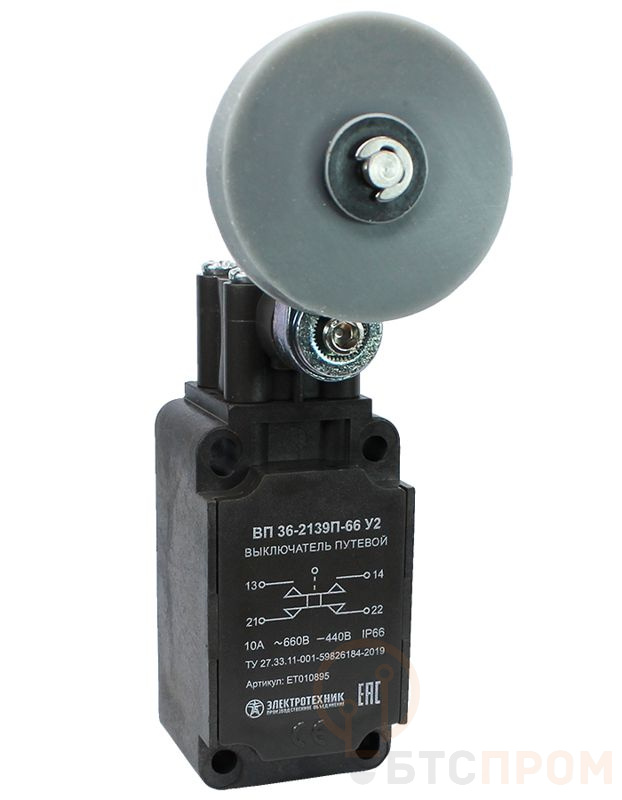 Выключатель путевой ВП 36-2139П-66 У2 1НО+1НЗ 3А IP66 рычаг с резиновым роликом диам. 50мм безинерционный 30х60мм без сальника Электротехник ET010895