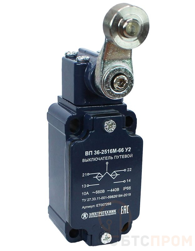 Выключатель путевой ВП 36-2516М-66 У2 1НО+1НЗ 3А IP66 рычаг со стальным роликом инерционный 30х60мм без сальника Электротехник ET007266