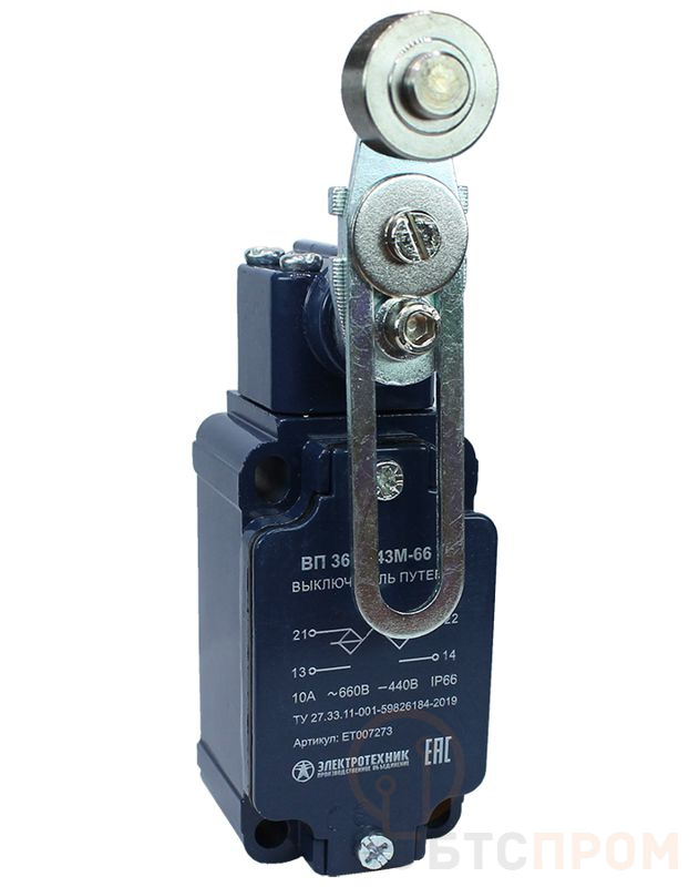 Выключатель путевой ВП 36-2543М-66 У2 1НО+1НЗ 3А IP66 рычаг со стальным роликом регулир. по длине инерционный 30х60мм без сальника Электротехник ET007273