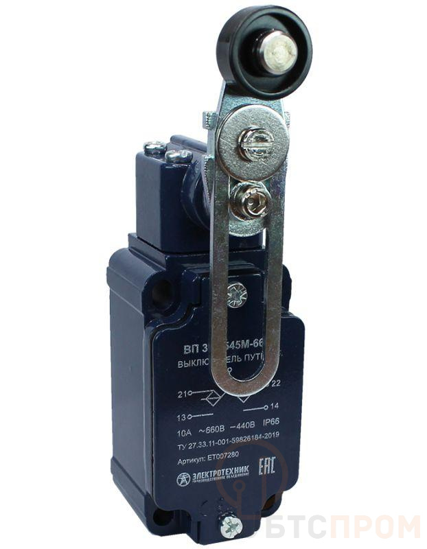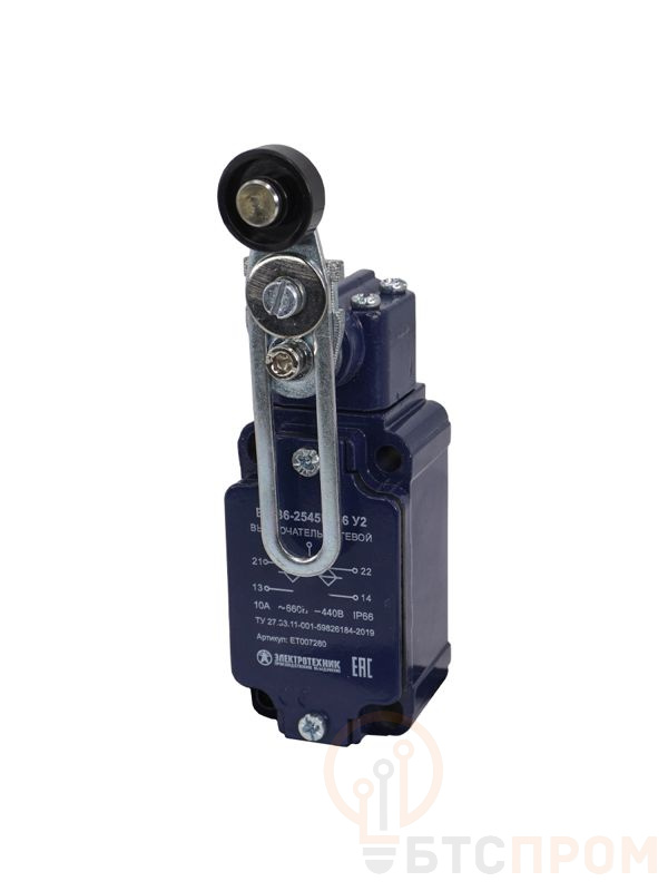 Выключатель путевой ВП 36-2545М-66 У2 1НО+1НЗ 3А IP66 рычаг с пластик. роликом регулир. по длине инерционный 30х60мм без сальника Электротехник ET007280