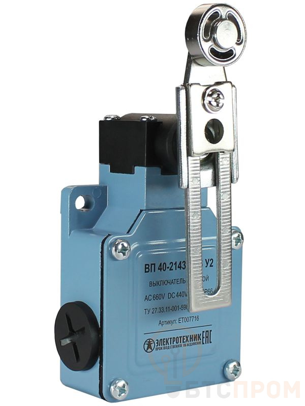 Выключатель путевой ВП 40-2143М-66 У2 1НО+1НЗ IP66 рычаг со стальным роликом регулир. по длине мгновенный без сальника Электротехник ET007716
