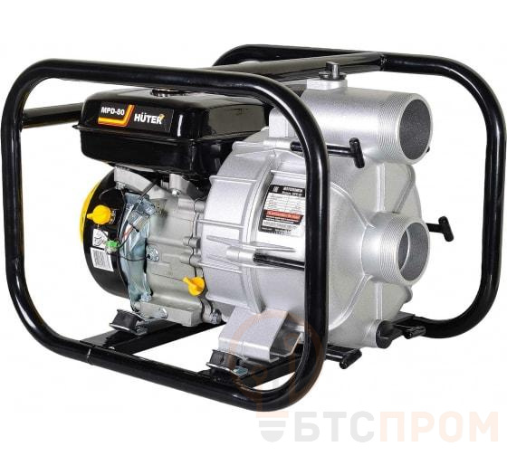 Тип двигателя 4-х тактный, одноцилиндр. Вес, кг 38.2 кг Бренд Huter Габариты упаковки 0.469 х 0.469 х 0.469 м Номинальная мощность двигателя, л.с. 7 Тип стартера Ручной Высота напора, м 32 Глубина всасывания, м 8 Вид топлива Бензин АИ-92 Тип мотопомпы центробежная, самовсасывающая Рабочий объем двигателя, см3 212 Скорость оборотов, об/мин 3800 Диаметр входного патрубка, мм/дюйм 80/3 Диаметр выходного патрубка, мм/дюйм 80/3 Макс. производительность, л/мин 1300 Объем бака, л 3.6 Тип воды Грязная Масса, кг 34 Мотопомпа HUTER MPD-80 предназначена для перекачивания как чистой, так и грязной воды. С ее помощью можно проводить осушение колодцев и подвалов, бассейнов и прудов, устранять последствия затоплений, подавать воду на значительное расстояние и высоту, тушить пожары. Мотопомпа может использоваться как элемент водоснабжения для частных домов и оросительных систем для полива большой площади. Бензиновый 4-х тактный двигатель мощностью 7 л.с. и объемом 212 см? обеспечивает производительность до 1300 л/мин. Технические характеристики модели позволяют эффективно откачивать воду с глубины до 8 м и подавать на высоту до 32 м. Диаметры входного и выходного патрубков при этом составляют 80 мм. Топливный бак объемом 3,6 л обеспечивает длительную бесперебойную работу. Прочный металлический корпус устойчив к механическим повреждениям. Компактные габариты обеспечивают удобное перемещение вручную или перевозку на автомобиле. Важные составные части мотопомпы, такие, как топливный кран, воздушный фильтр, заливная горловина, защищены от внешних воздействий, но при этом находятся в быстрой доступности для обслуживания. Это обеспечивает длительный срок эксплуатации изделия.